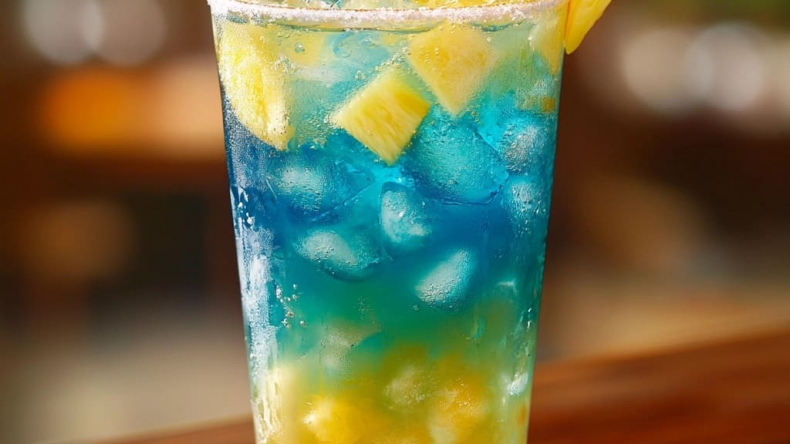 Un cocktail rafraîchissant et festif, mélangeant ananas, citron et l’intensité du bleu curaçao pour une boisson aux couleurs et saveurs exotiques.