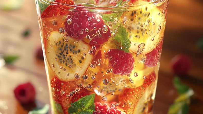 Une explosion de saveurs avec de la fraise, de la framboise et du fruit de la passion, associés à une base pétillante. Une revisite colorée et gourmande du mojito.