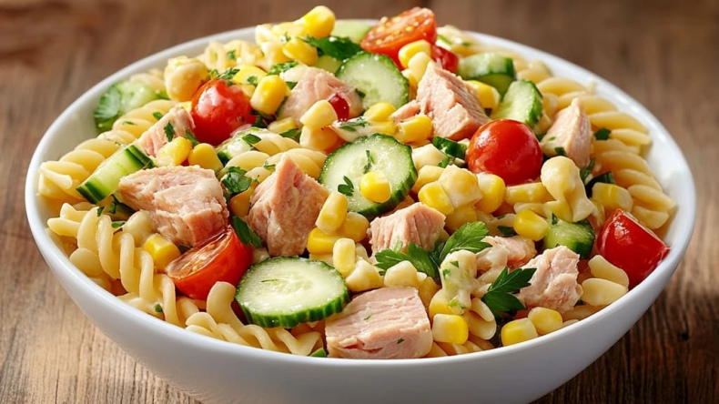 Une salade composée de pâtes torsades, thon, tomates cerises, concombre, maïs, et une sauce fromagère crémeuse. Une option fraîche et complète pour un repas léger.